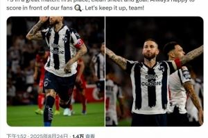 拉莫斯社媒晒出比赛照片,配文:“感觉真棒!在一场精彩的比赛中全取三分——榜首、零封和进球,在我们的球迷面前破门总是很开心,让我们继续加油!”