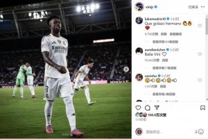 维尼修斯社媒晒出比赛照片,莫德里奇留言评论:“多么精彩的进球,兄弟。”