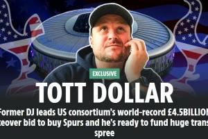 太阳报表示由科技企业家布鲁克林-厄里克组建的一个12人团队提出了这一惊人的报价。厄里克和他的合作伙伴出价33亿镑想买下热刺,并准备再拨出12亿英镑作为球员预算,包括工资、转会费和经纪人费用,供热刺主教练弗兰克在明年一月转会窗开启后使用。这一总报价超过2022年由伯利财团以42.5亿镑收购切尔西的记录。